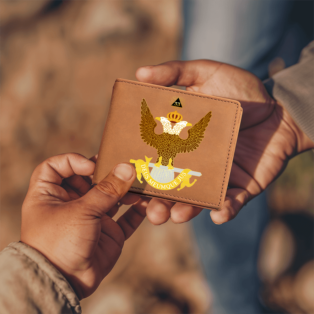 Looking for a thoughtful and attractive gift for that special man in your life? Our Scottish Rite 33rd Degree Mason WU Leather Wallet is the way to go! This handsome bifold wallet exterior is made of the highest quality genuine full grain cowhide. It's recognized for its amazing feel and appearance. Both durable and smooth, the wallet's warm brown color will take on a rich, vintage look, getting better with time and use. The unique design is vibrantly printed on the front and carefully shipped in a handsome black and white gift box - making this a gift to treasure for years to come!